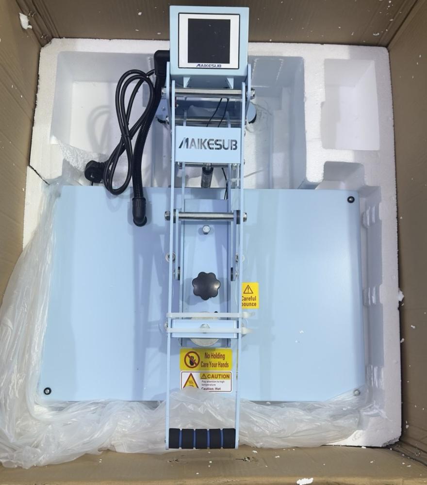 - التجهيز: قم بتوصيل المكبس وتشغيله، وضبط الحرارة والوقت حسب نوع الخامة (مثلاً: 160 درجة / 15 ثانية للـ DTF).