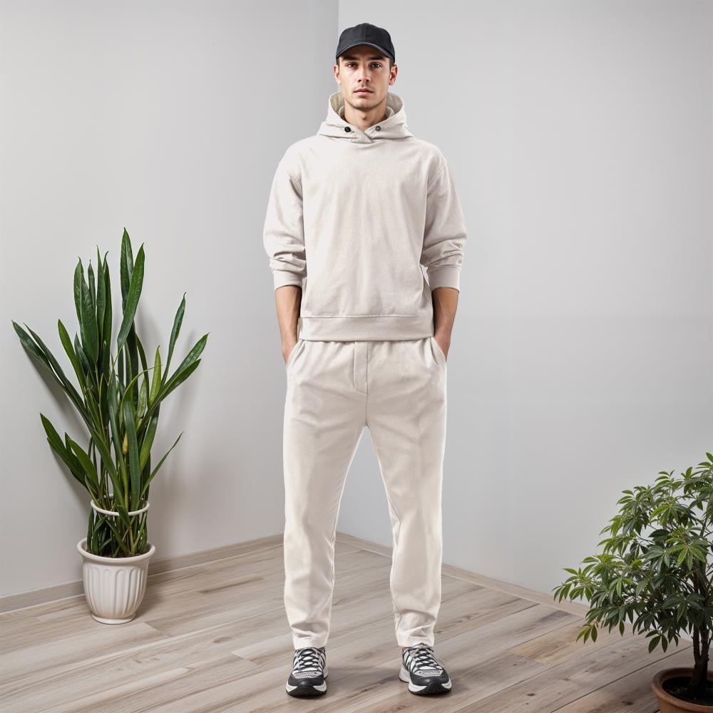 اختيارك لأفضل إطلالة شتوية يبدأ مع طقم تيشيرت وبنطلون رجالي أوفر سايز كريمي لما يجتمع الأناقة مع الراحة.