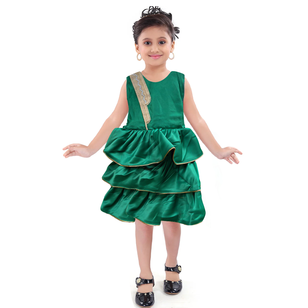 فستان اطفال اخضر طبقات مزخرف بيج وطني